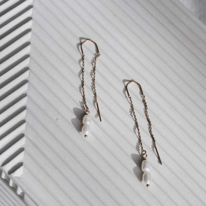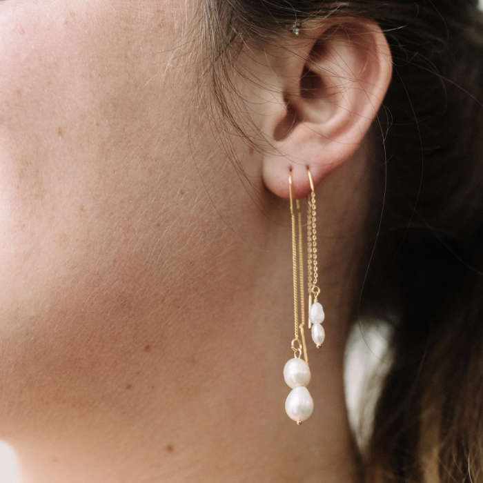 These delicate, gold chain earrings finished with pearls play well with any look while you network, listen to audiobooks at 3x speed, or finish your newest puzzle. Just right as an accent earring for a second piercing or as a standalone.